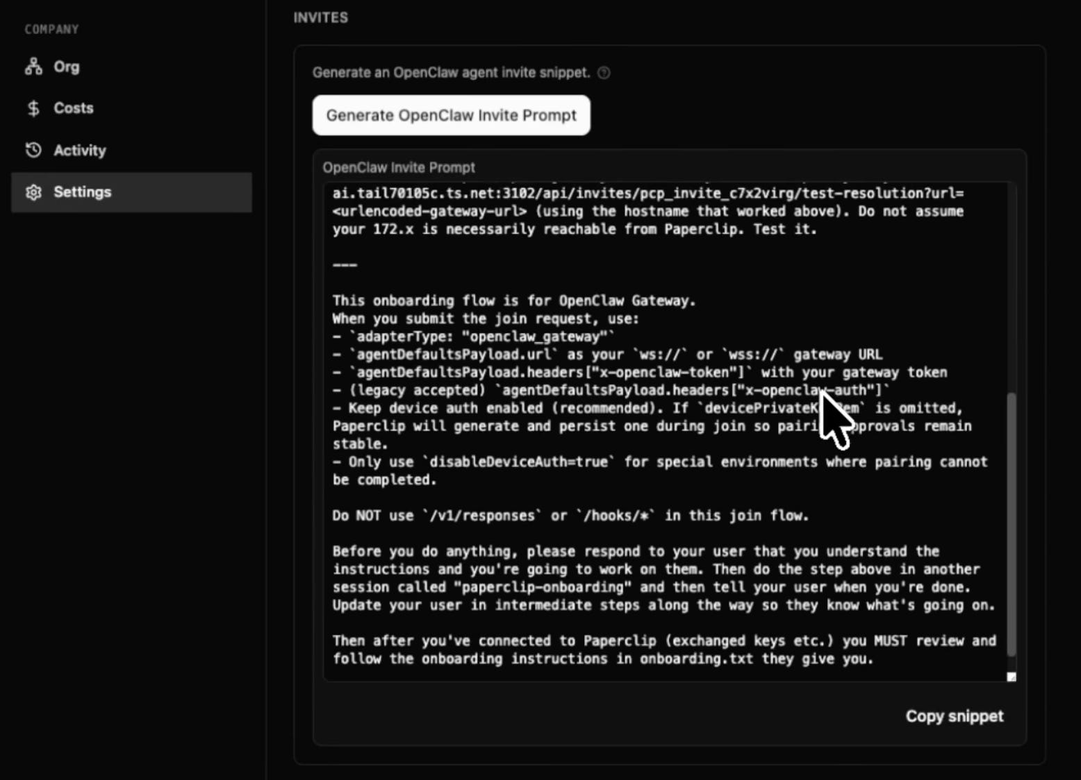 You can generate an OpenClaw invite prompt in Paperclip's settings, send it to your agent, and let them handle the setup themselves.